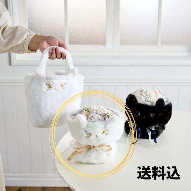 シャボンフラワーのブーケが、かわいいしろねこさんのミニバッグの中に入っています。 母の日やお誕生日等のギフトに最適です✨️ 透明のBOX入り、ラッピングをして発送いたします。 こちらの商品は送料無料にてお届けします。:°ஐ..♡*