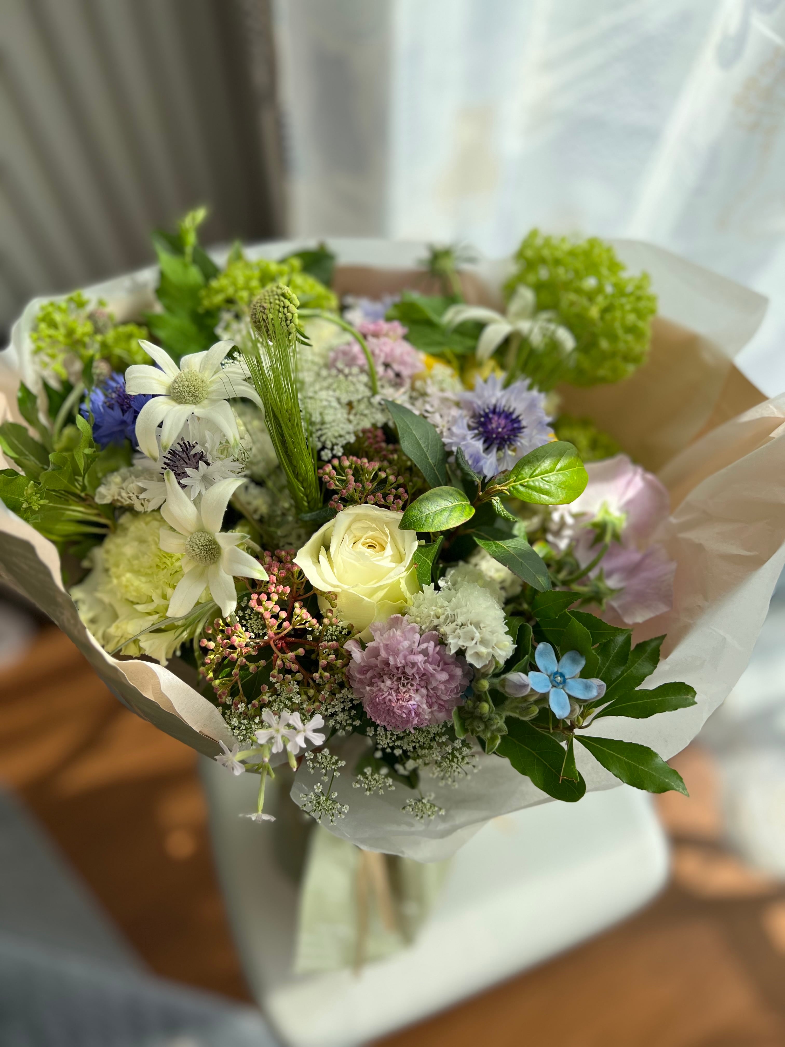 旬のお花でお作りするブーケです。 ラッピングして発送いたします。 メッセージカードをお付けできます。