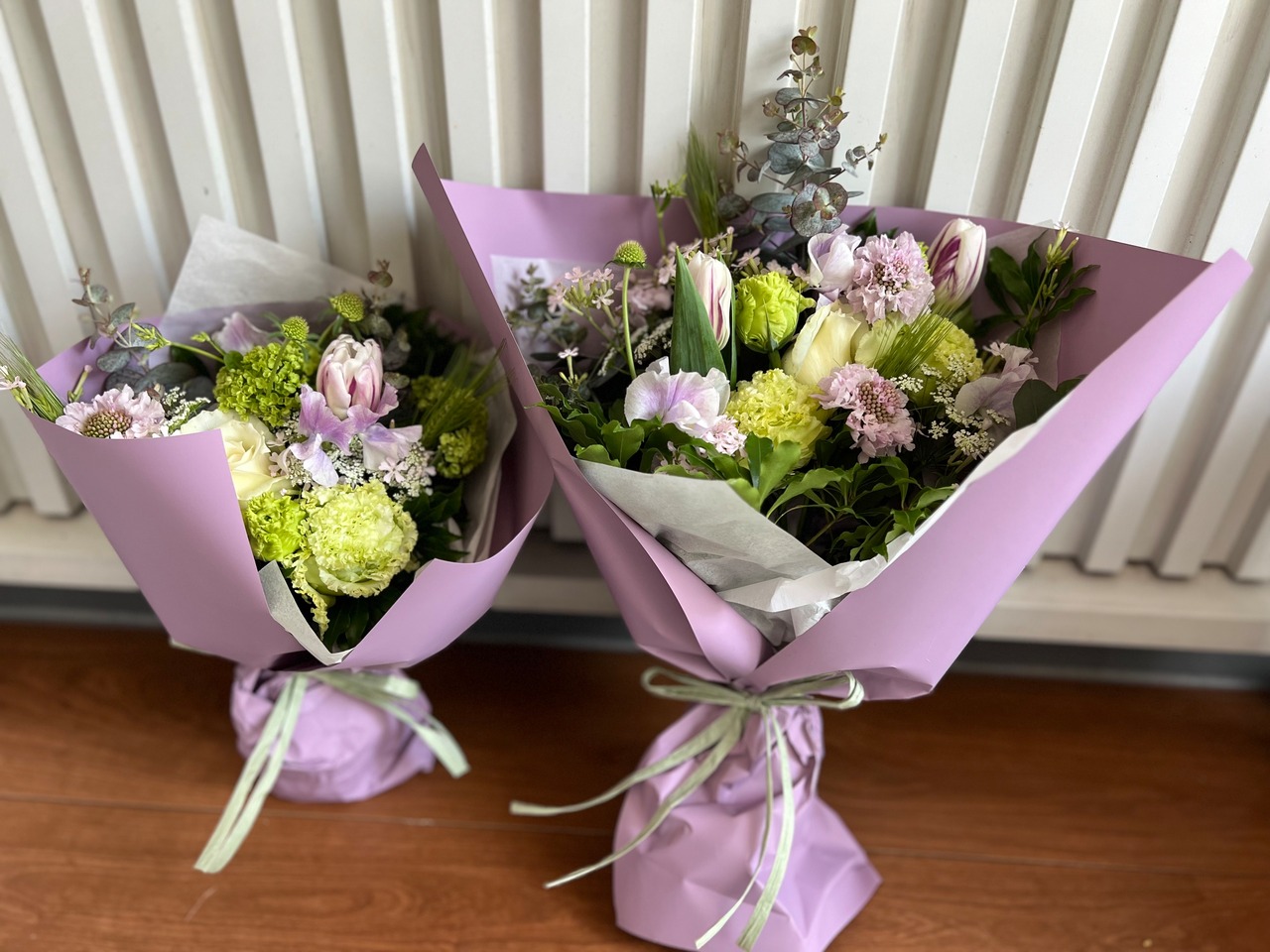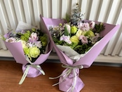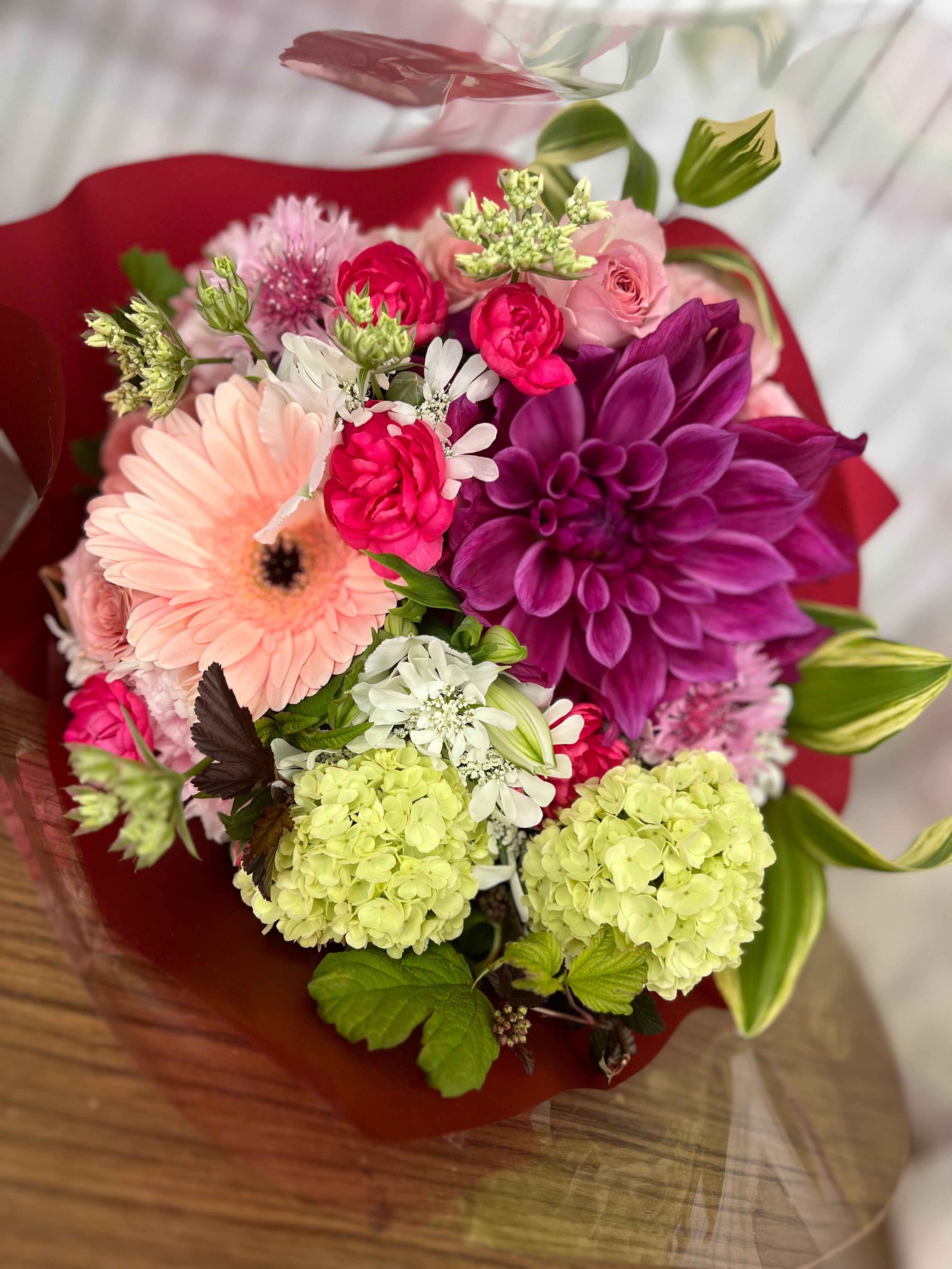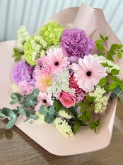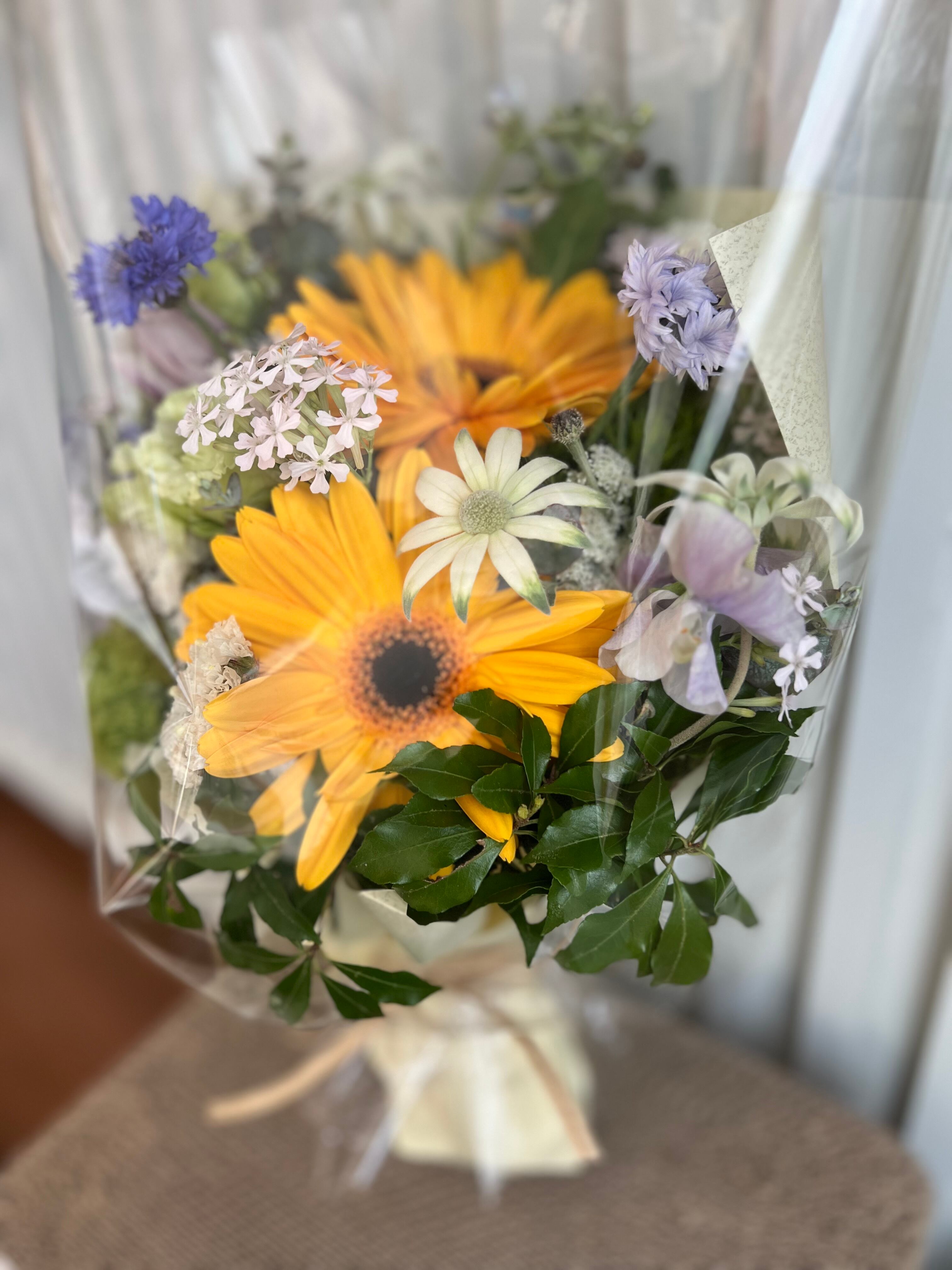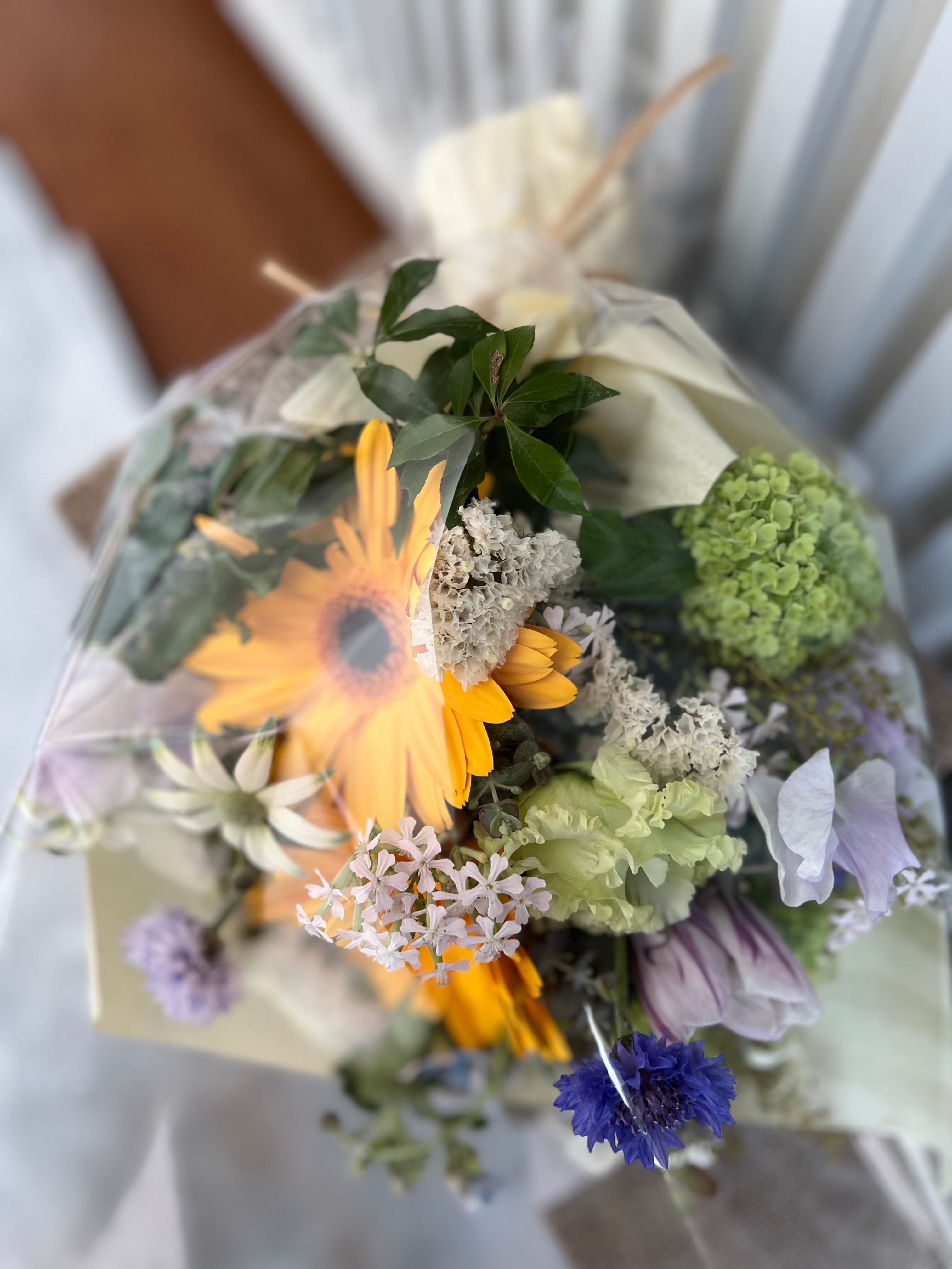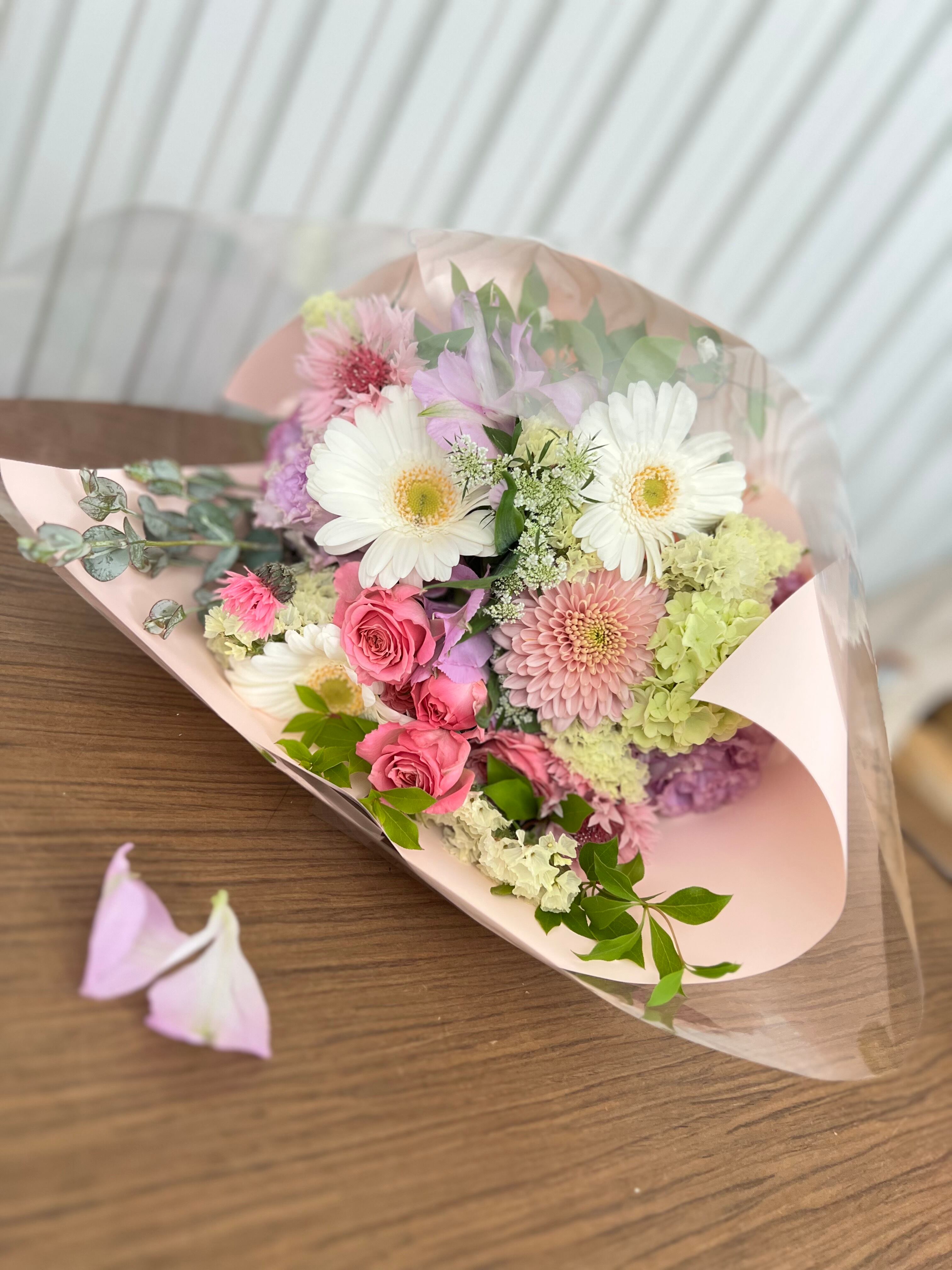 旬のお花でお作りするブーケです。 ラッピングして発送いたします。 メッセージカードをお付けできます。