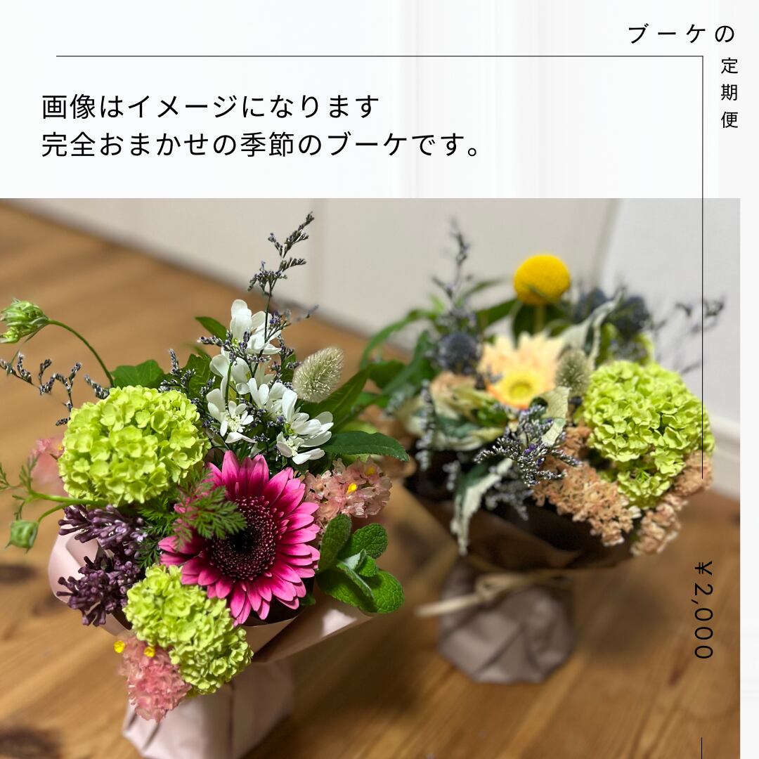お花は季節のおまかせになりますので色合などお選びいただけませんが、旬のオススメのお花をお送りいたしますので毎月のお楽しみにしていただければ、と思います♡